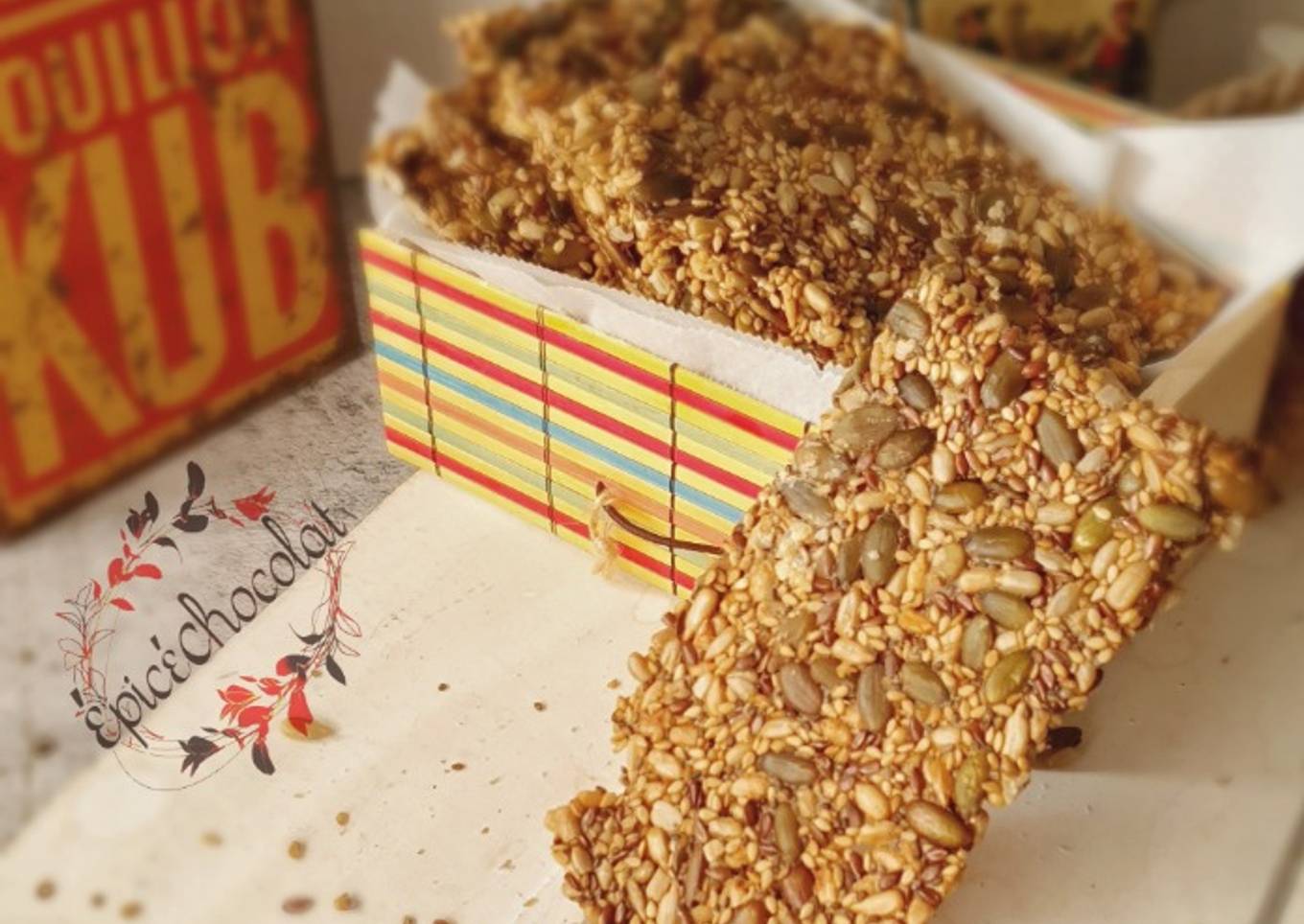 Je propose une recette simple sans farine, sans sucre, avec très peu de gras (hormis celui des graines en elle-même), craquante, avec une pointe de sel de Guérande.