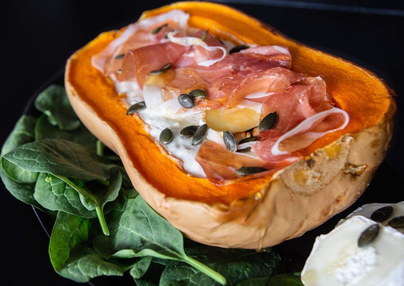 Instructions to make to make Butternut farcie au chèvre, miel et jambon cru
