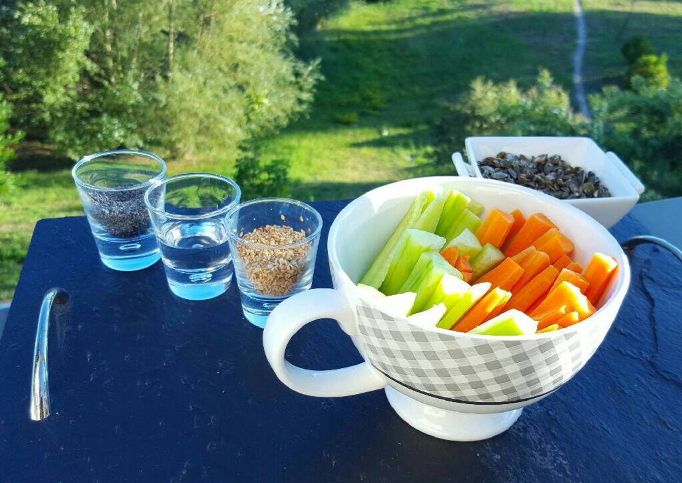 - Pour le pavot et le sésame, mettez un verre avec de l'eau, tremper le bâtonnet de légume dans l'eau et puis dans le pavot par exemple.