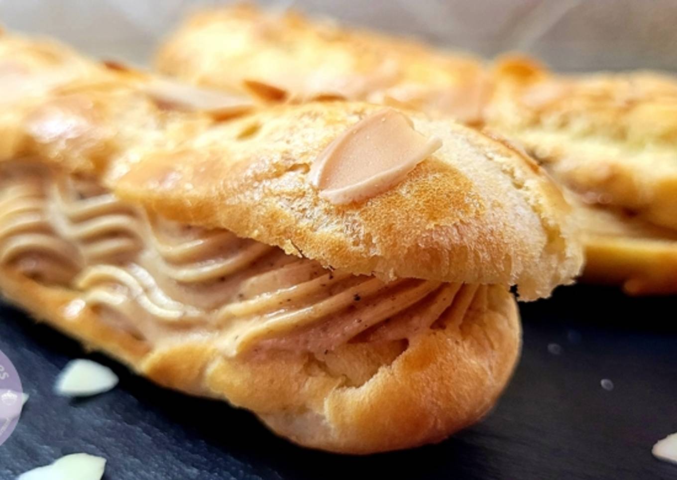 👉 Placez les amandes effilées essentiellement sur le dessus et non les côtés pour faciliter le découpage des éclairs ensuite.