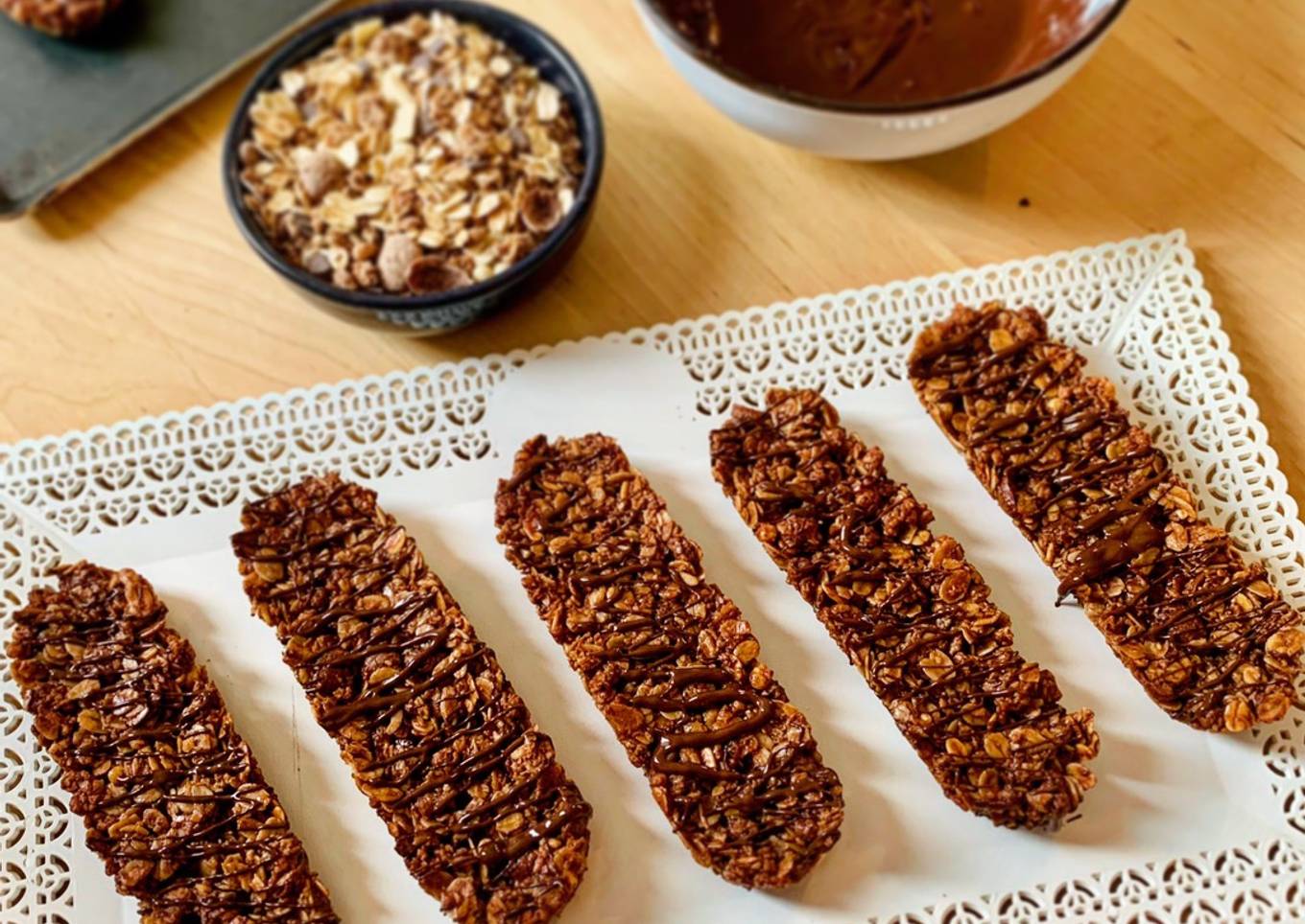 - Cuire 15 minutes à 180 degré. Laisser refroidir et mettre 30 minutes au congélateur. Faire fondre le chocolat noir au bain marie. Nappez le dessous des barres avec le chocolat fondu. Laisser sécher.