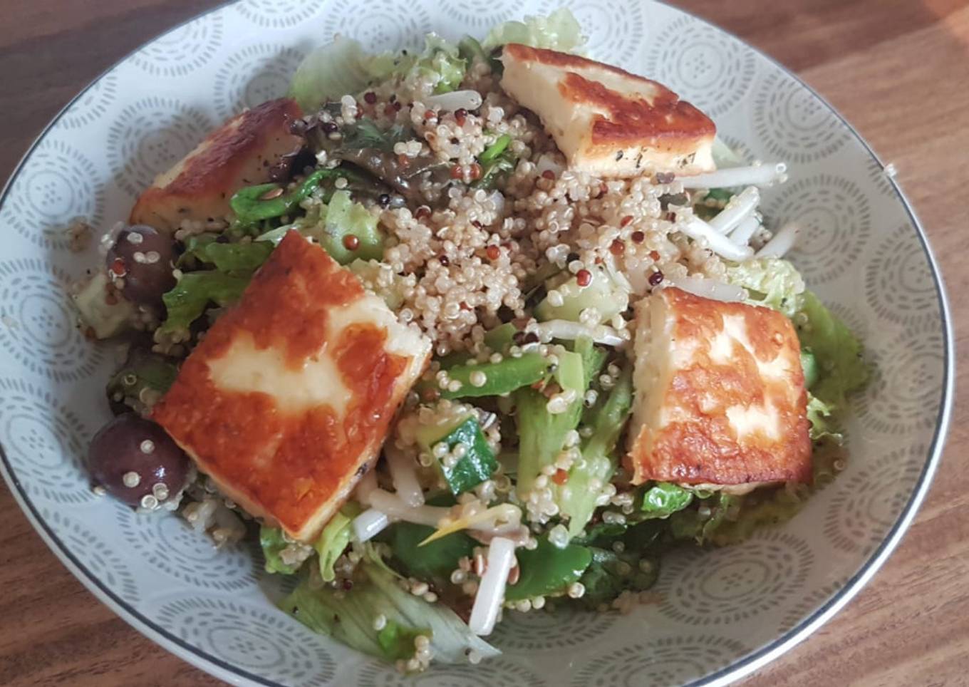 - Dans une poêle avec un fond d'huile de sésame, faire revenir les tranches de halloumi sur chaque face. Réserver.